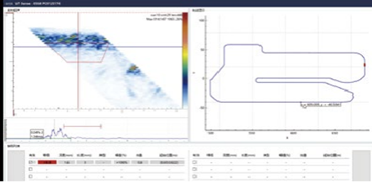 应用更广泛角度线扫(S 扫)实时显示检测结果检测轨迹实时显示,不同颜色代表不同判定等级 缺陷列表自动显示缺陷深度、长度、幅值、当量及位置坐标 双击缺陷列表中任意缺陷,可实时显示该缺陷位置扇扫图以及轨迹图位置。 检测报告显示最终判定结果,以及每个缺陷在轨迹的对应网格位置。 |